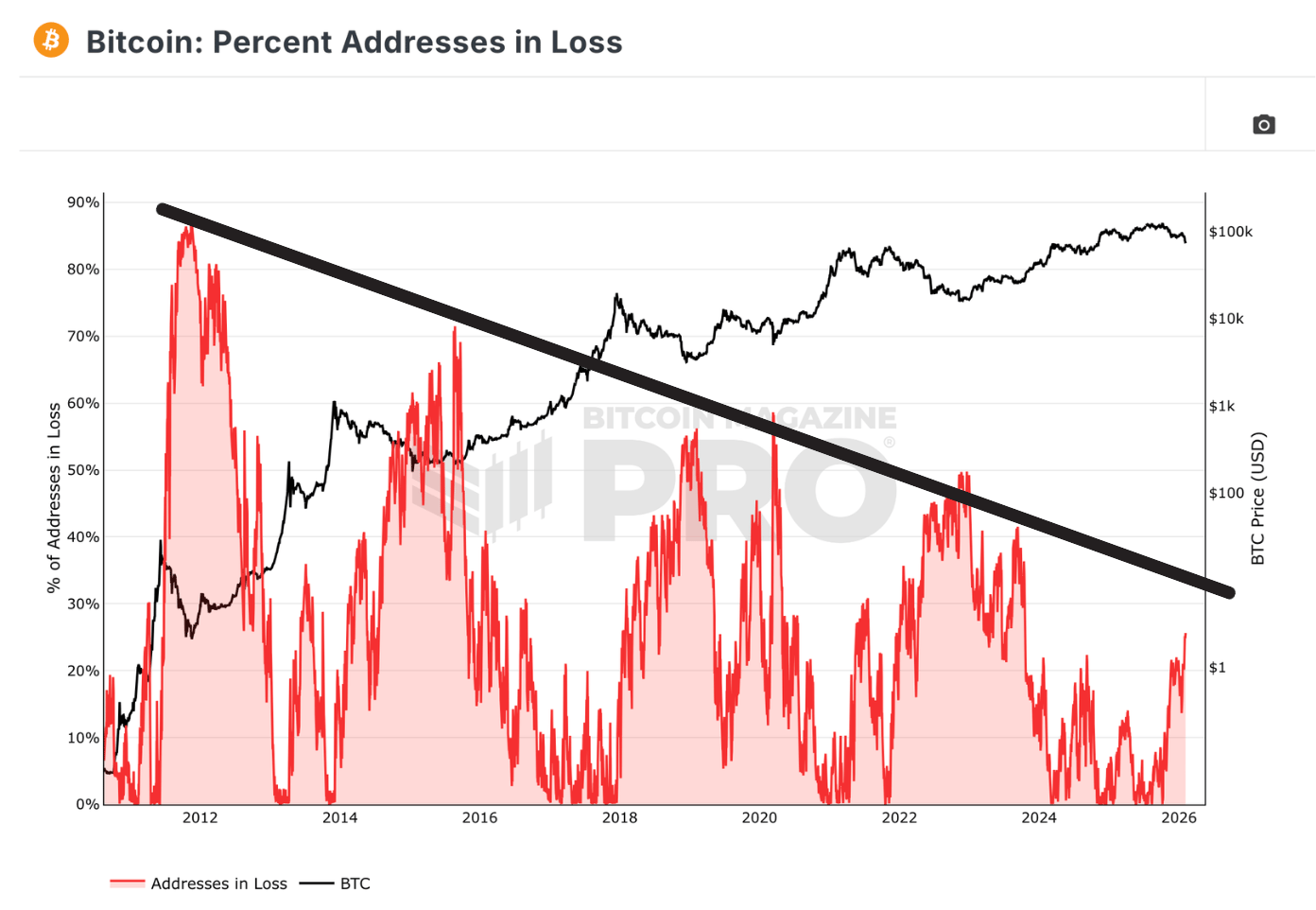 Grâce aux données de Bitcoin Magazine Pro, on remarque qu’il faut de moins en moins d’adresses en perte pour trouver un bottom en période bearish. Dit autrement, les opérateurs ont tendance à capituler plus rapidement qu’auparavant :