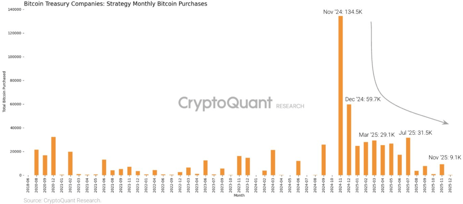 Faisons à présent un point sur la demande des entreprises. Selon les données de CryptoQuant, le rythme des achats de BTC de l’entreprise Strategy a chuté depuis fin 2024. Aussi, on voit que les achats sont assez faibles depuis le mois d’août :