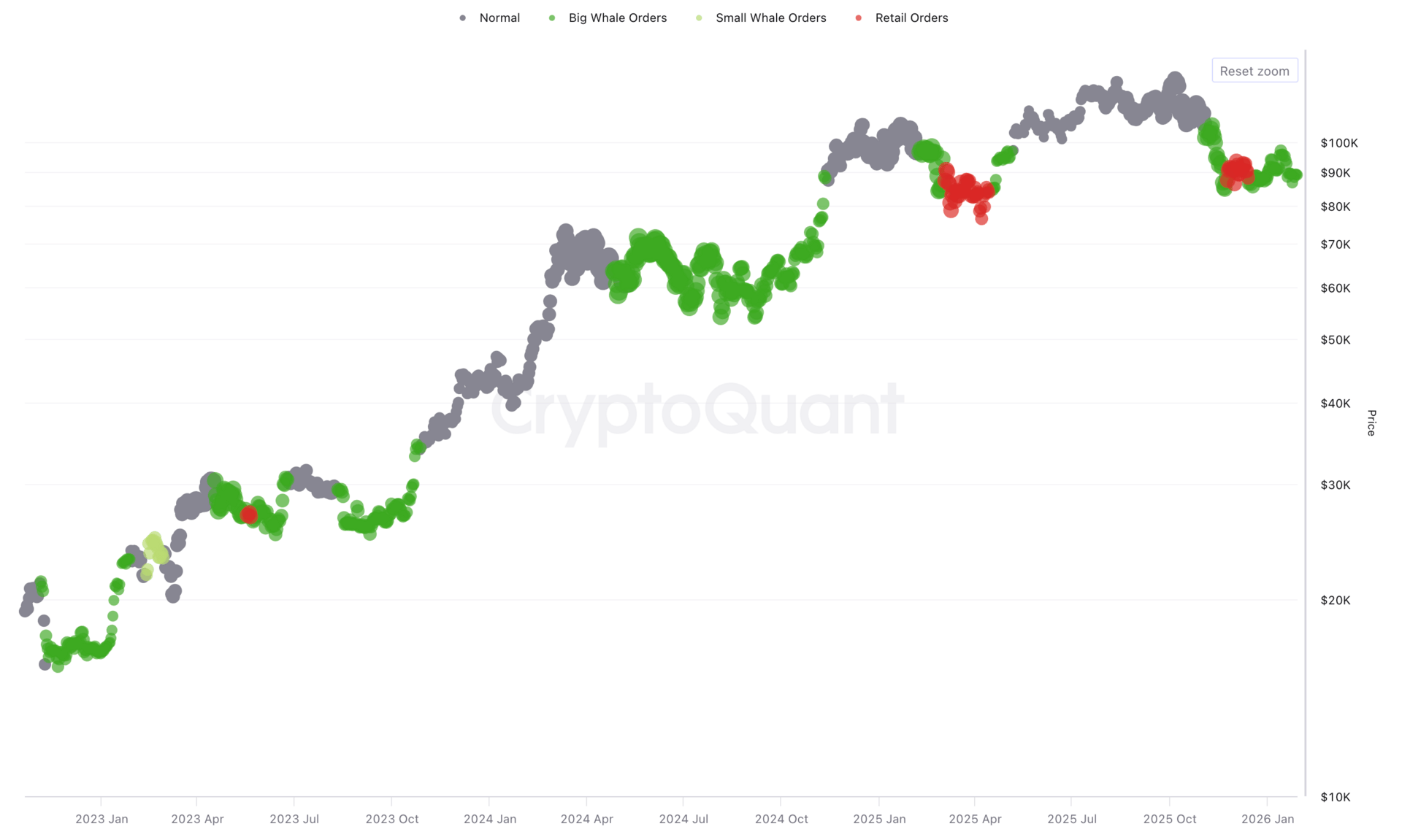 Le prochain graphique permet de connaître l’activité des retails et des whales sur le Bitcoin. Voici comment il faut l’interpréter :