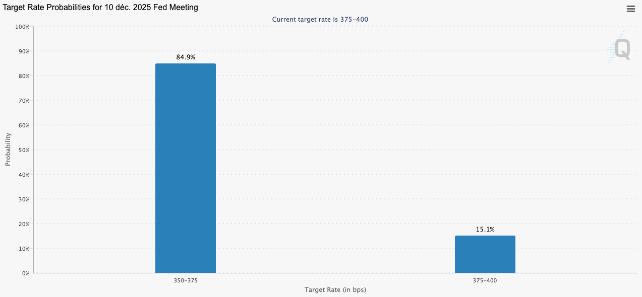 Souvenez-vous, la semaine dernière, on avait vu qu’une baisse de taux était très peu probable selon le FedWatch Tool. Mais seulement une semaine plus tard, la situation a évolué positivement. Il y a désormais 85% de chances d’avoir une baisse de taux lors de la prochaine réunion de la Fed du 10 décembre :