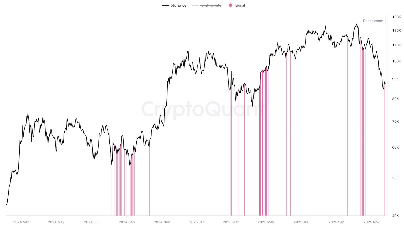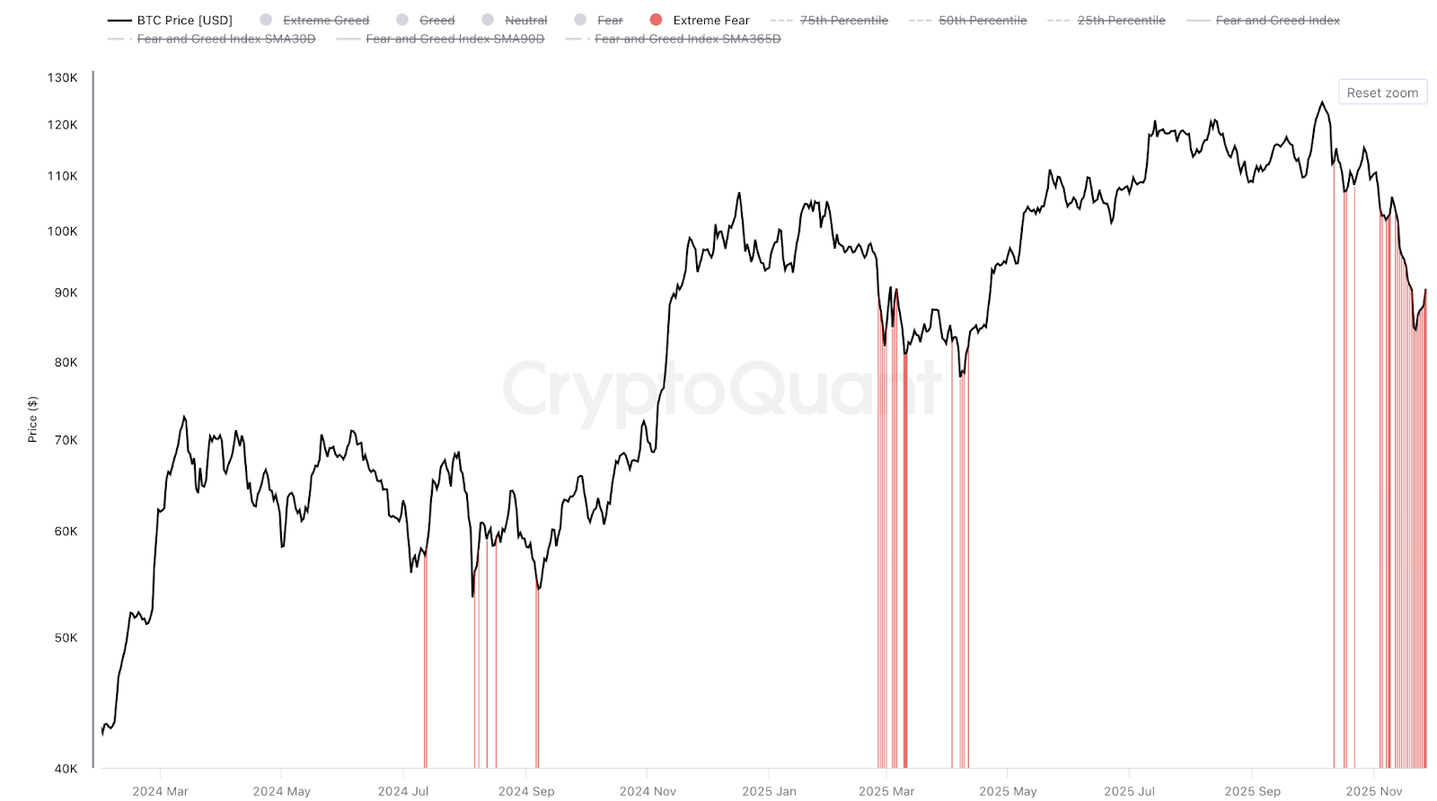 Le sentiment de marché est relativement faible depuis plusieurs jours. Le Crypto Fear and Greed a pointé à 10, un niveau extrêmement bas sur cet indicateur de sentiment de marché. Des conditions similaires avec une peur extrême ont été enregistrées à deux reprises depuis 2024. Et les deux dernières fois, le BTC avait construit un bottom :