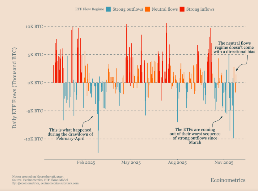 Le graphique montre les flux quotidiens des ETF Bitcoin classés selon trois régimes :