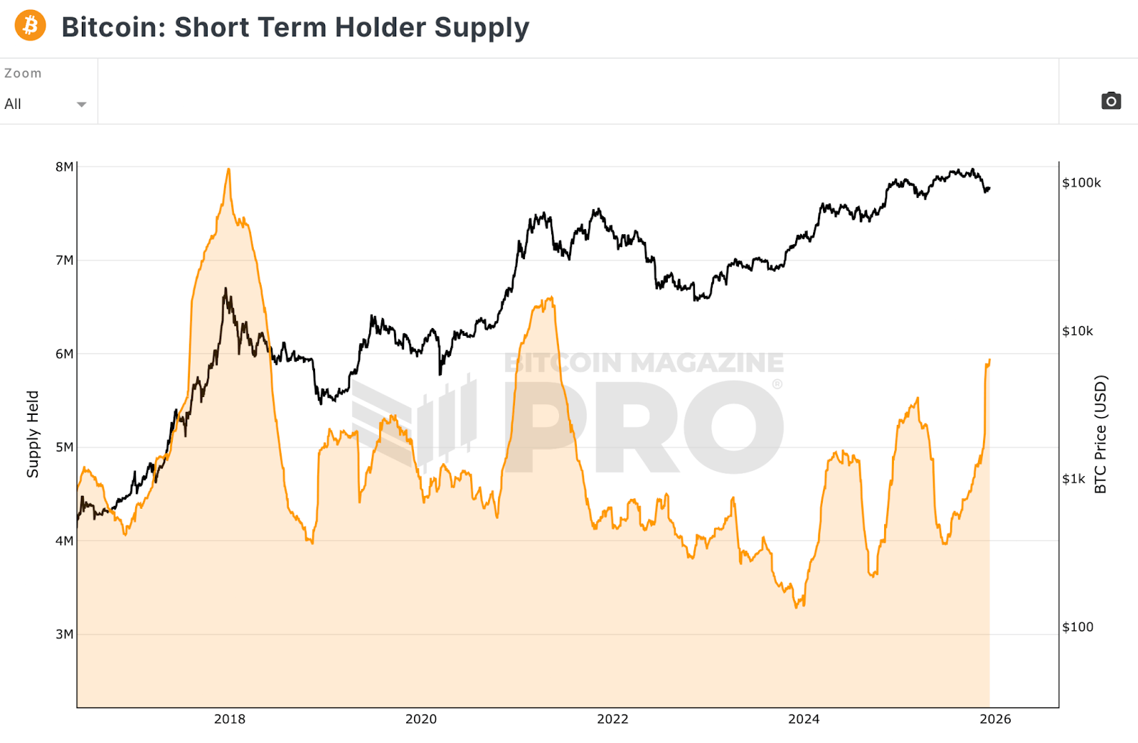 Aussi, l’offre détenue par les détenteurs à court terme est en train de progresser selon les données du site Bitcoin Magazine Pro :