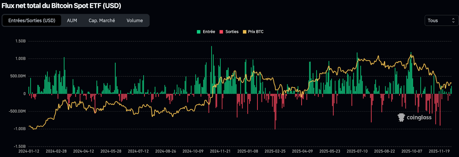 Finalement, on voit que la pression vendeuse diminue avec le retour du BTC autour du prix moyen d’achat des ETF spot.